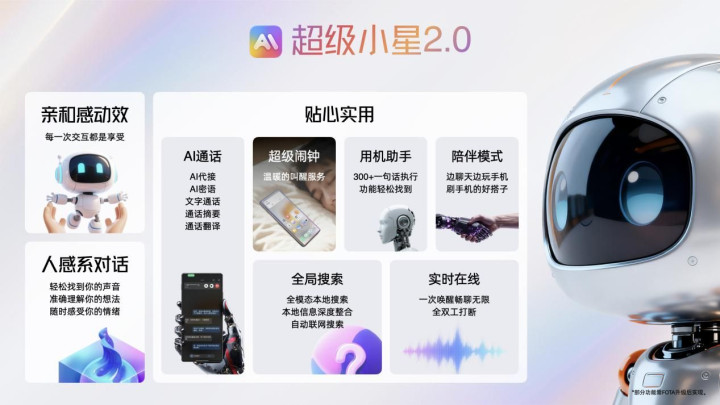在交互体验上,系统内置超级小星2.0功能,支持亲和感动效与人感系对话,可实现全双工打断,一次唤醒后即可持续畅聊,交互更自然。实用功能方面,系统包含超级闹钟、AI通话助手、文档内容搜索等模块,其中AI通话助手支持AI代接、通话摘要、通话翻译、文字通话功能,超级闹钟提供个性化叫醒服务,文档内容搜索可快速定位信息;同时支持300+一句话执行操作,功能查找更高效,还设有陪伴模式,满足边聊天边用机的需求。